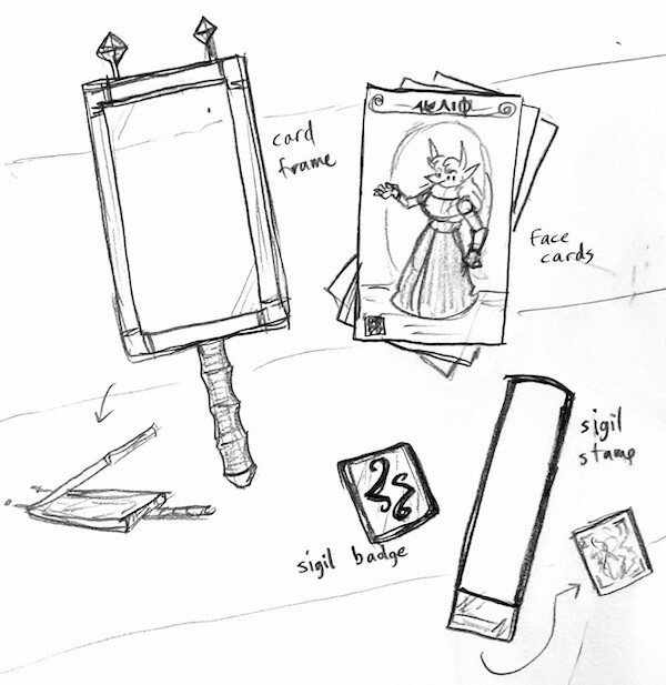 Thanks! It was inspired by cryptography (the private key is your badge, the public key is your set of face cards to hand out), but there was a little more equipment needed to make it make sense in-world.