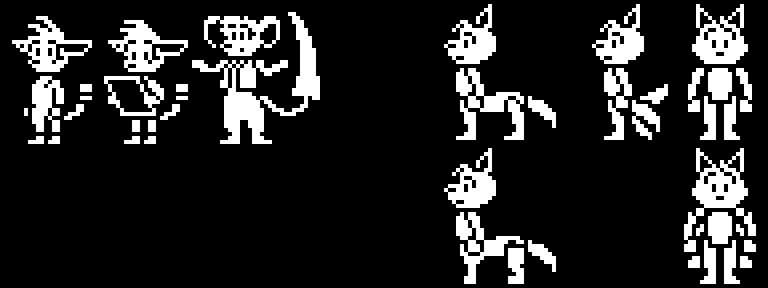 Messing with 1-bit pixel art a little more, trying to get a good style going for characters. Patch and Fala over on the left, and some generic marfish people on the right to try out different limb arrangements.