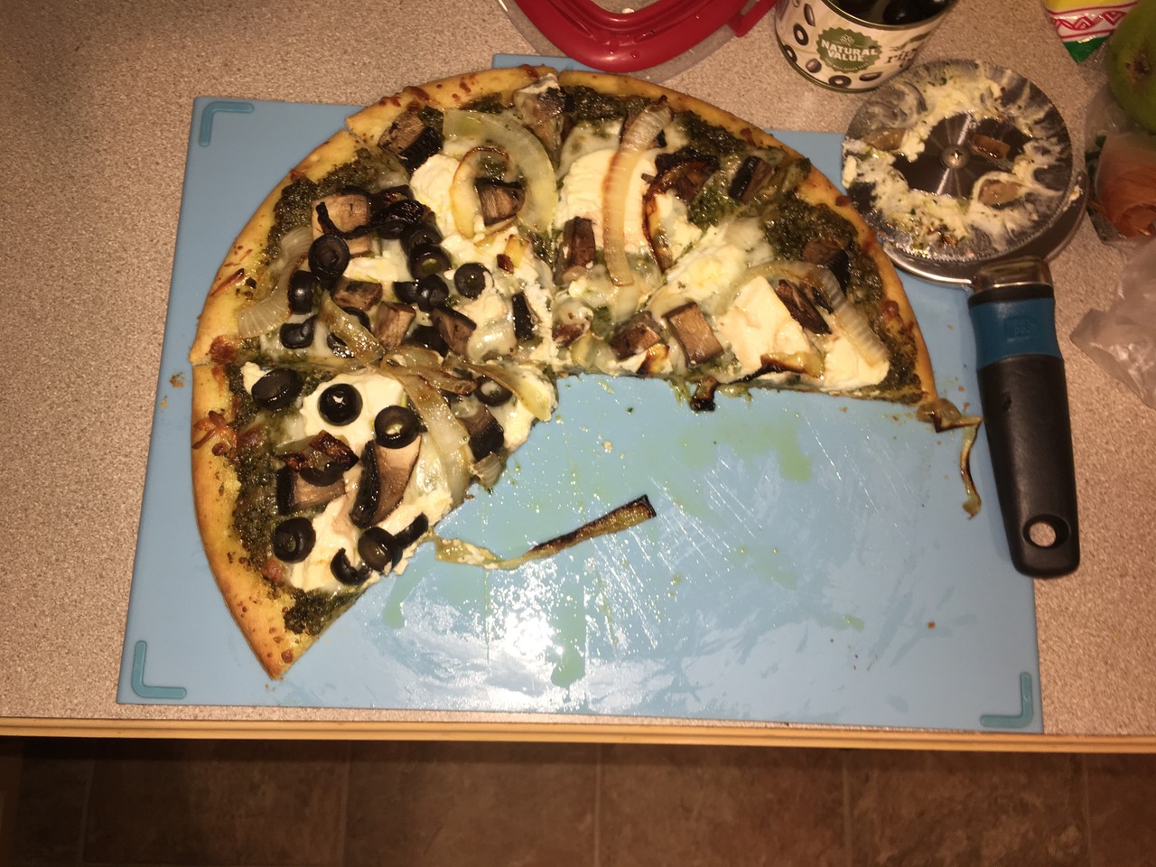 Dinner: pre-made crust, pesto from scratch, goat cheese, black olives, Portobello mushrooms, caramelized sweet onion. (@Kistaro also made a pizza, but it's too gone to photograph.)