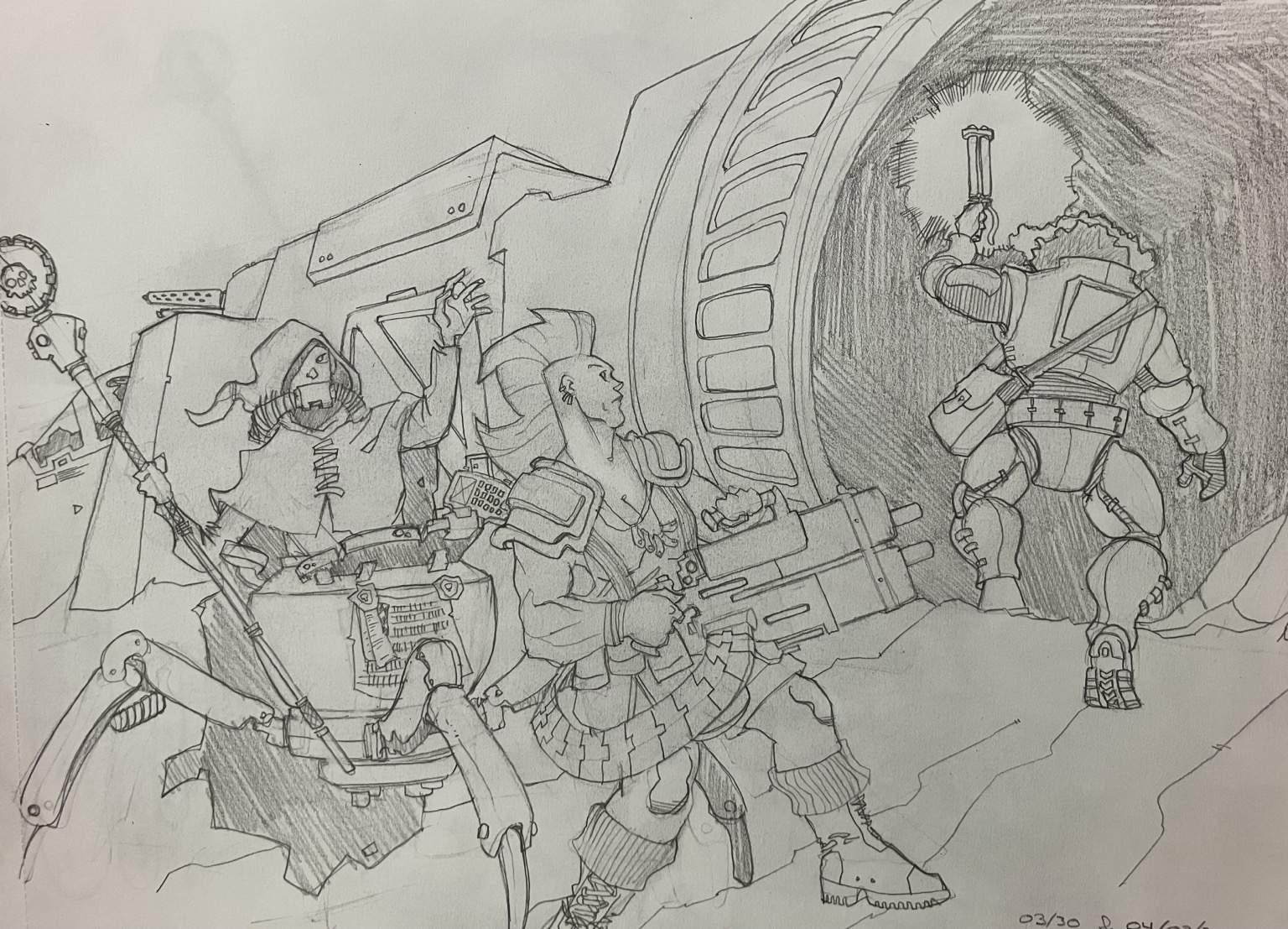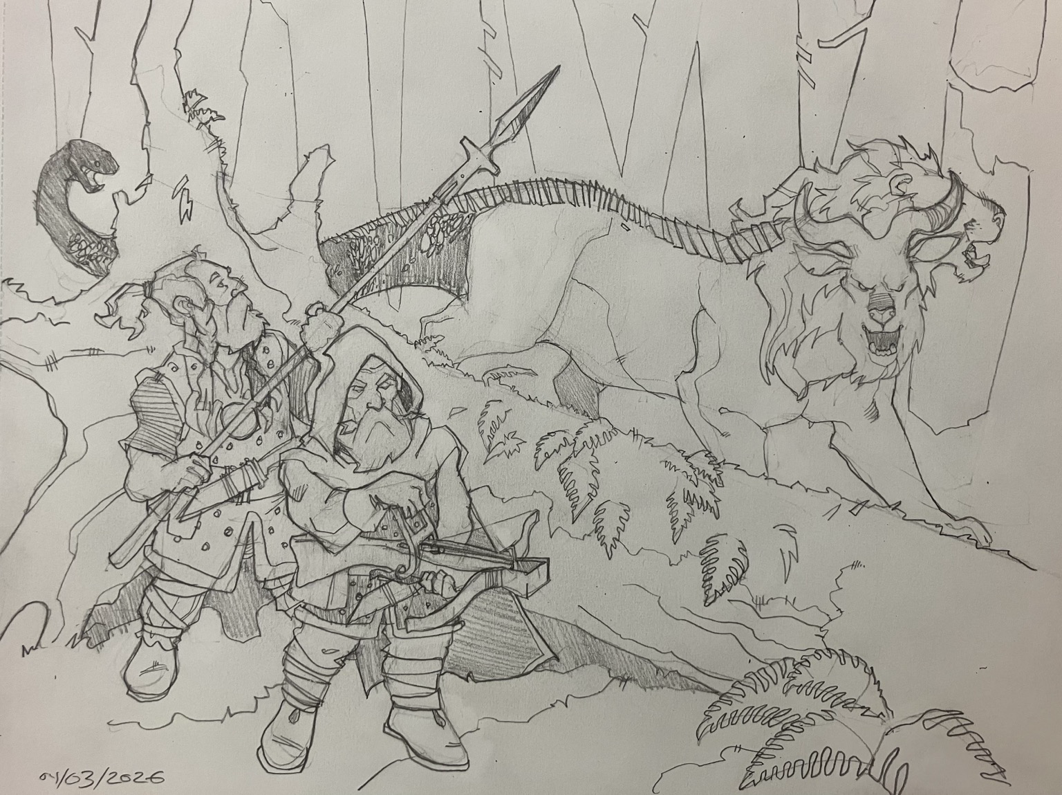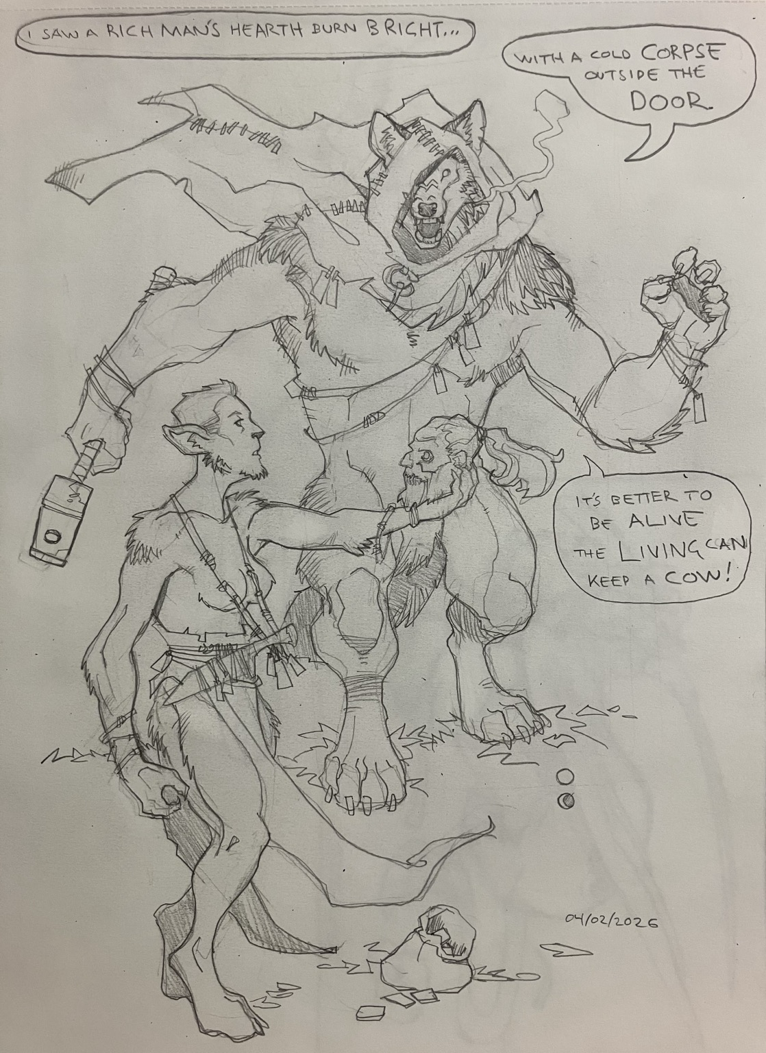 Last night’s #drawing was apparently evil dudes with good beards. Description; an evil wizard, mounted on a big stallion on a hill, looks over and talks to the evil dwarf crew of one of his army’s cannon. Banners and vague figures in the background suggest a larger force.