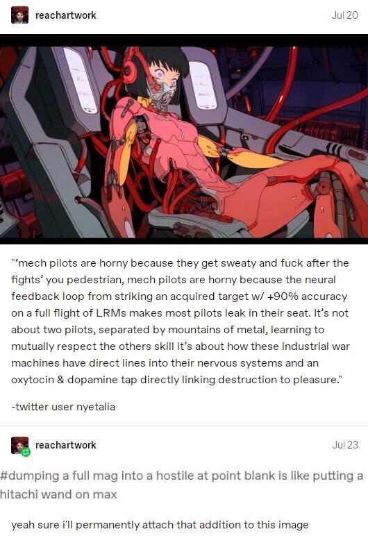 @LexYeen you realize that this makes the men (and women, because saying so is NOT gonna piss anyone off more than the rest of this statement) of the Adeptes Astartes relatively ace or possibly pan because literally getting plugged directly into power armor is better than sex for them, which probably explains why it's so easy to convince someone who'd otherwise be a corpse to be jacked into a dreadnaught for centuries on end.