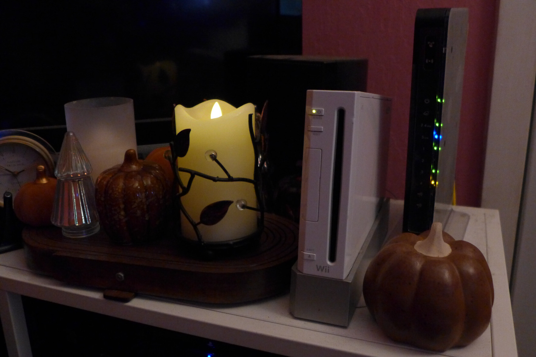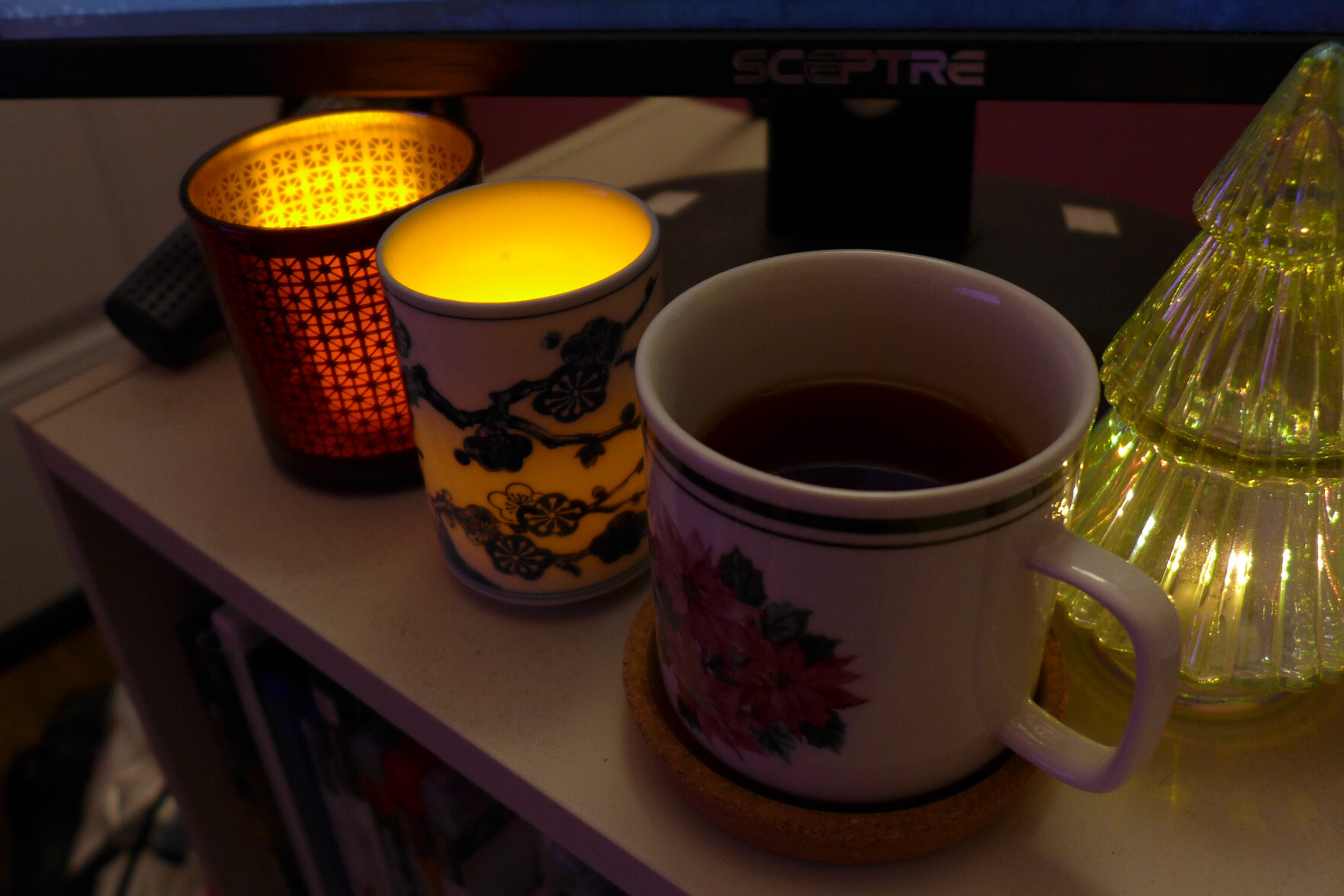 @Leucrotta @Tvorsk We also got another glass tree the other day, it's got like dark gray flecks on the inside and will probably look beautiful lit up! No space to set it up on the desk, though, so it's just stuck behind the big candle at the moment.