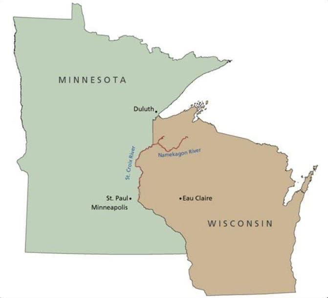 Minnesota looks like a mouth trying to eat Wisconsin.