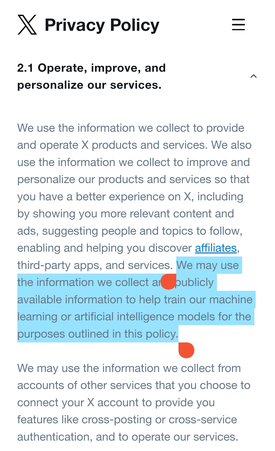 So uh, news have been reaching that the Muskrat has updated the 2.1 section of birdapp's privacy policy to mention it using public stuff for AI training. (https://twitter.com/en/privacy#x-privacy-1)