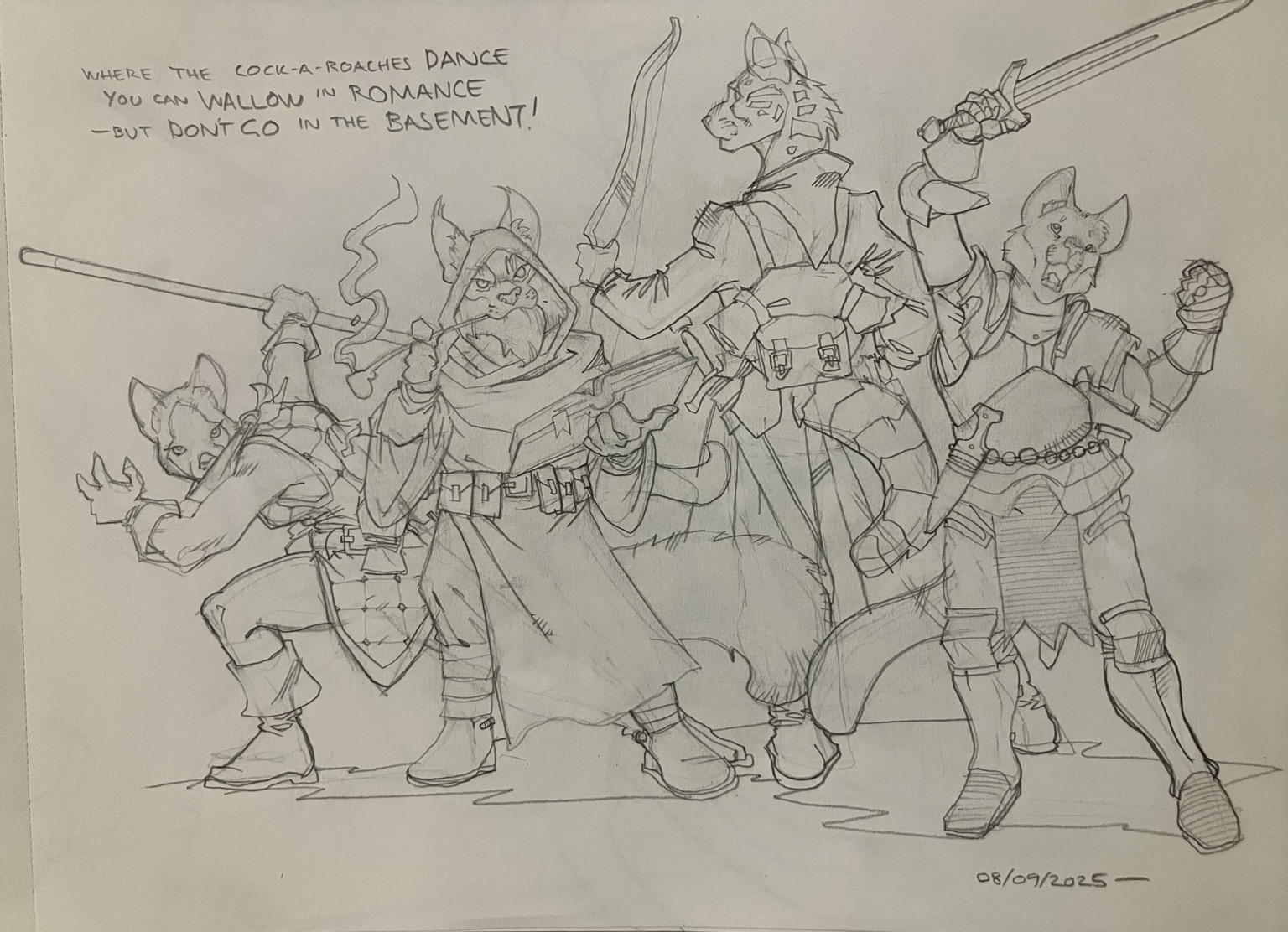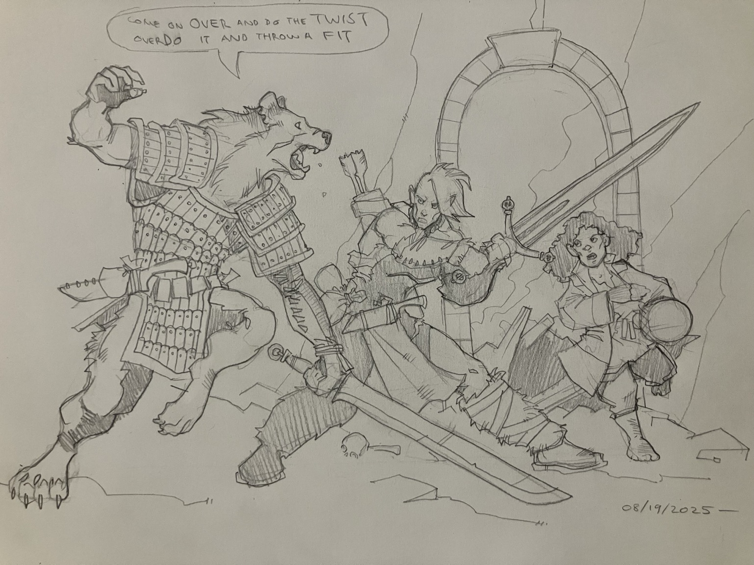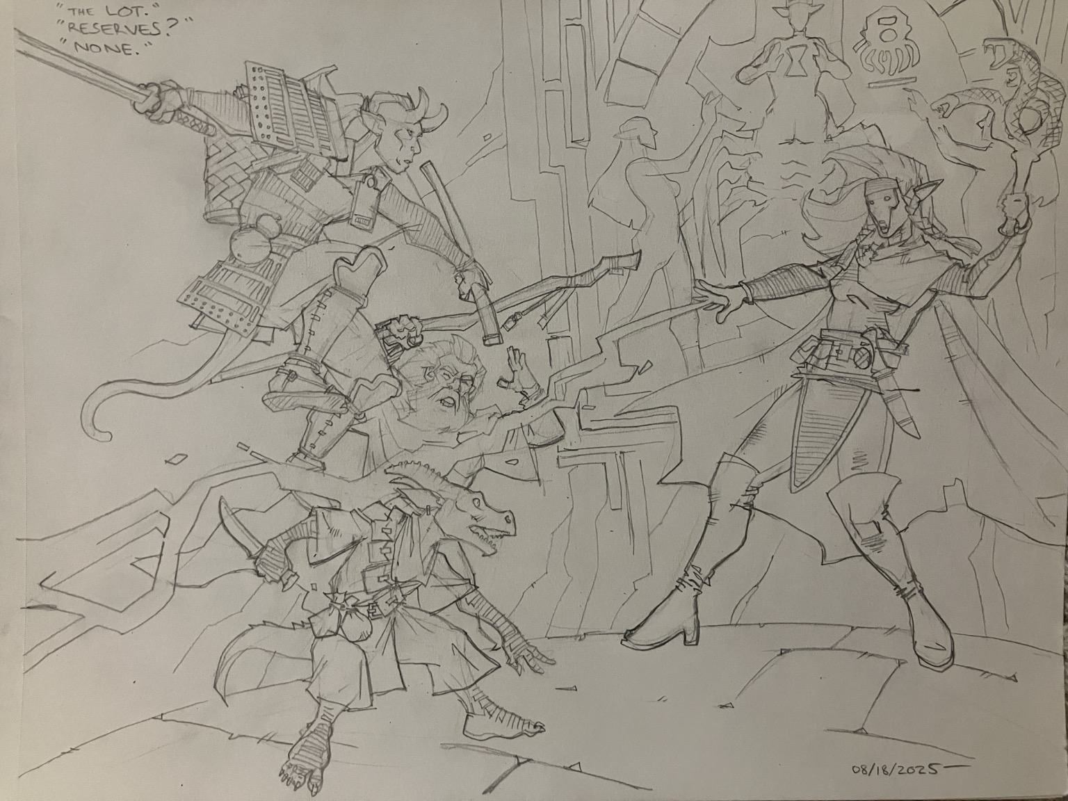 #drawing last night; in an Underdark shrine to Lolth, three adventurers (kobold rogue, tiefling samurai and dwarf druid) confront a lightning throwing drow priestess.