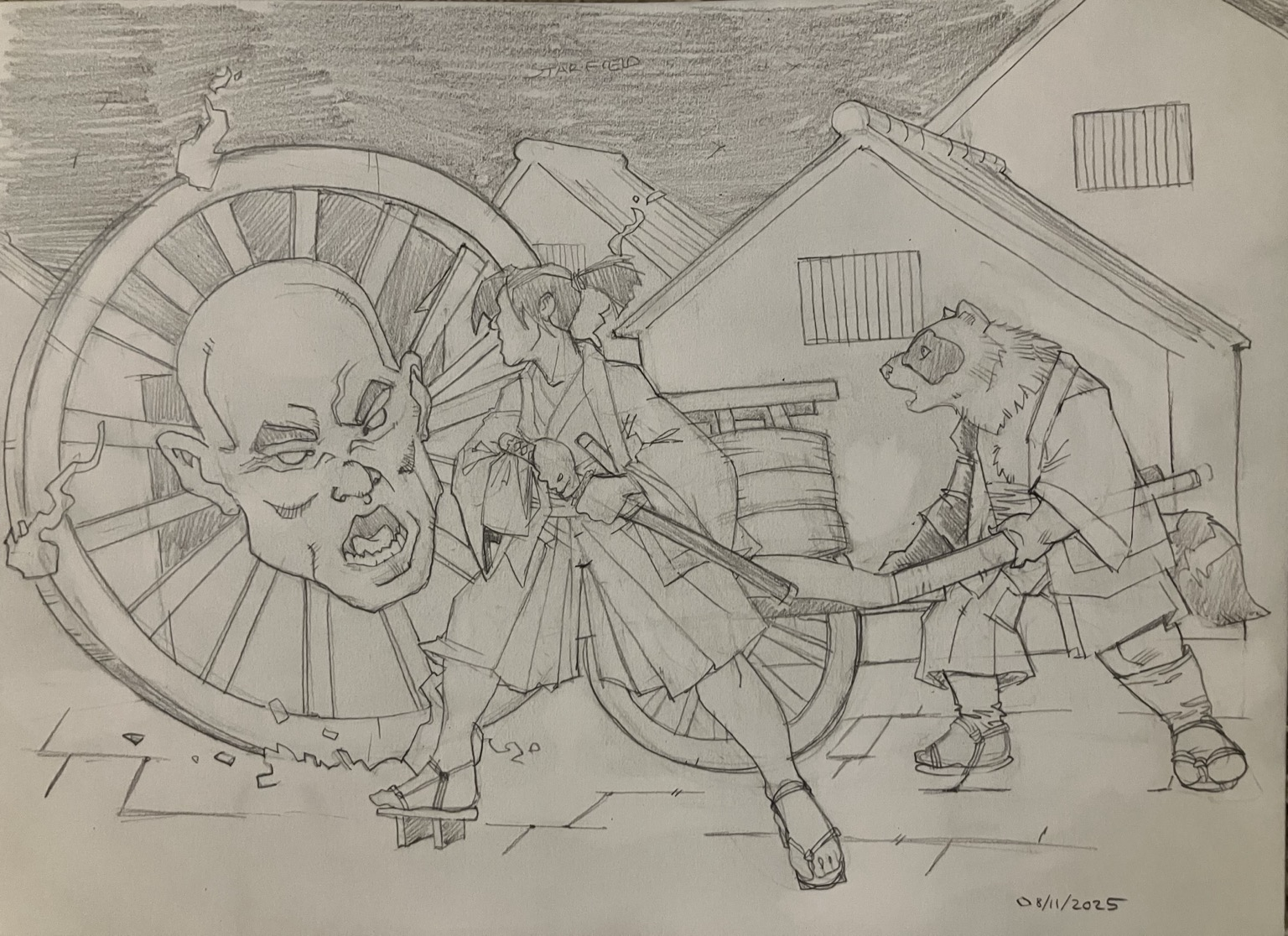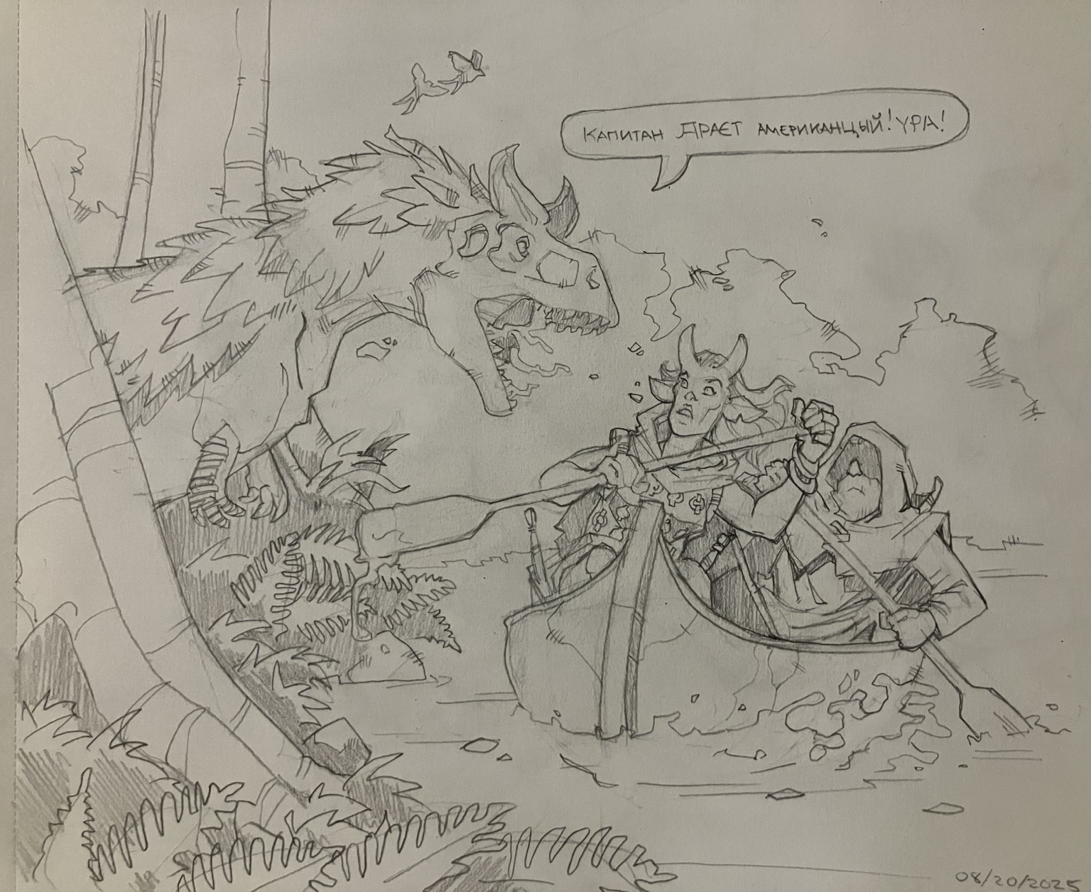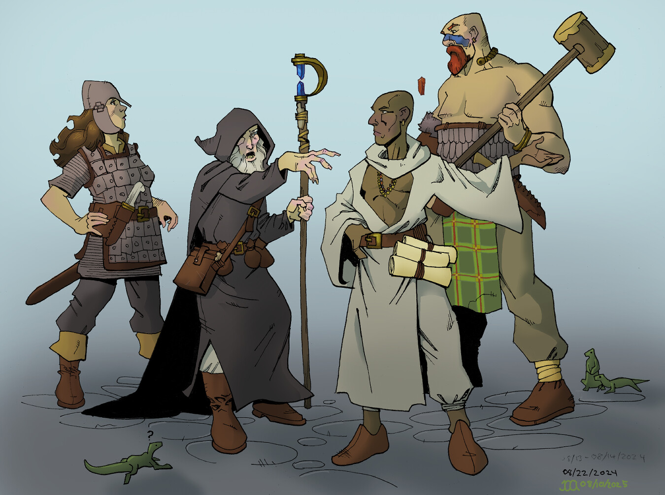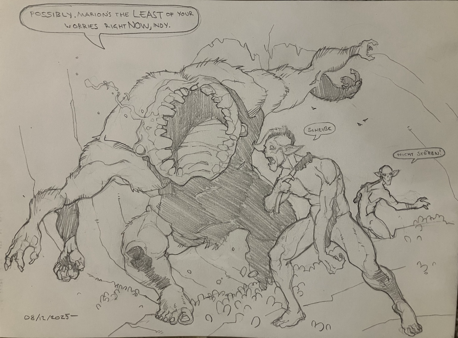 #drawing last night; in an Underdark shrine to Lolth, three adventurers (kobold rogue, tiefling samurai and dwarf druid) confront a lightning throwing drow priestess.