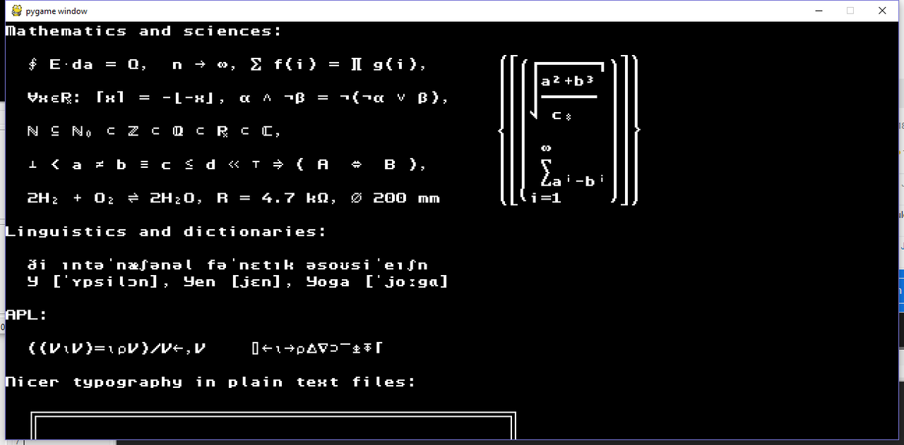 Putting my pixel fonts to the test, rendering a UTF-8 test page (from cl.cam.ac.uk/~mgk25/ucs/exampl). They look pretty good! They're still incomplete in a few places, though - no polytonic Greek, no Thai, no Georgian, and I'm still missing a lot of miscellaneous symbols.
