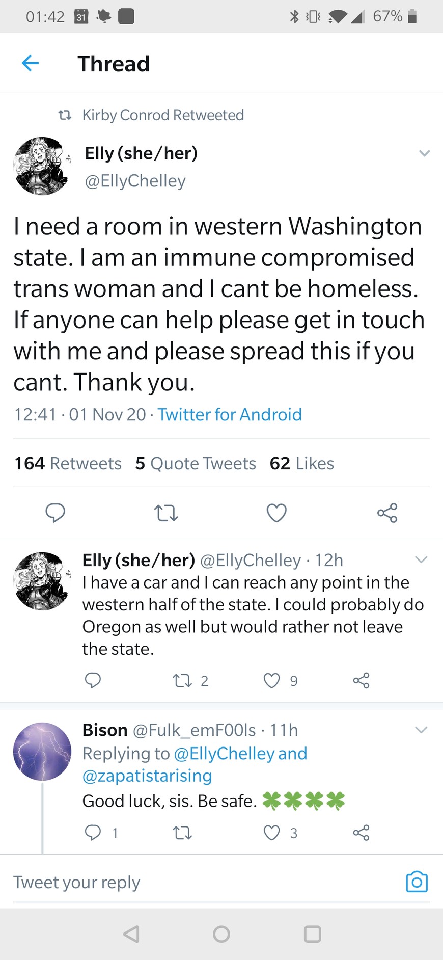 Twitter user @/EllyChelley says: "I need a room in western Washington State. I am an immunocompromised trans woman and I cant be homeless. If anyone can help please get in touch with me and please spread this if you can't. Thank you."