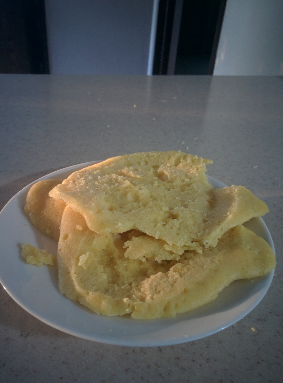 Previously I've tried this in a mug-based form, where the pancake is a sort of muffin/pudding thing. This time I tried a method of pouring the batter onto non-stick paper, then putting paper on top of that, doing another, and so on.