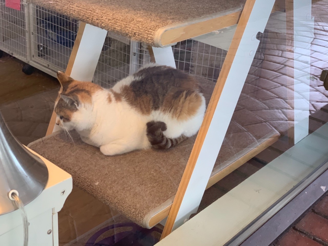 (Image description: a calico cat, seen through a window, sitting on cat furniture, her tail curled up along her belly.)