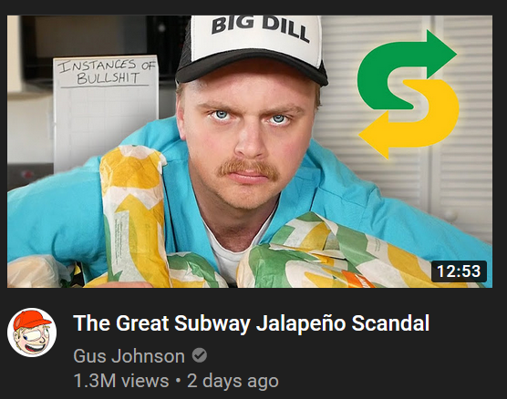This looked like a parody when it first came across my YouTube recommendations, but apparently it's not, dude is really upset about subway jalapenos.