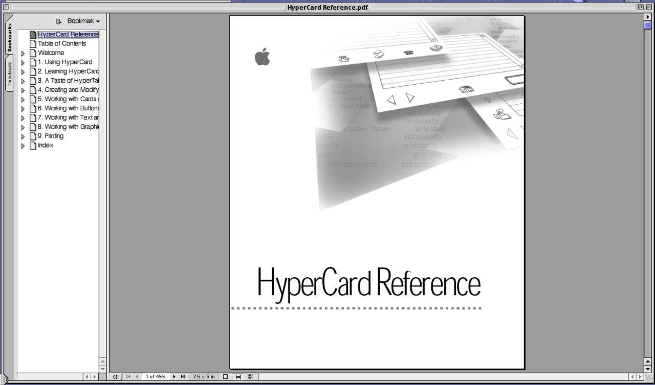 I feel like I need a Pismo PowerBook and the full HyperCard Reference in paperback in order to really immerse myself in the mood – a VM with Acrobat Reader 5.0 is *kinda* close, though https://awoo.space/media/mlItOimqMptfuJhv2qo https://awoo.space/media/0oQGSqLegpjIrXDiBBY