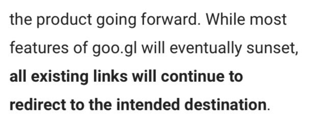 hey google stopping use of goo dot gl is a thing but please stop retweeting that inflammatory article because the announcement does in fact note existing links are not being deleted https://developers.googleblog.com/2018/03/transitioning-google-url-shortener.html