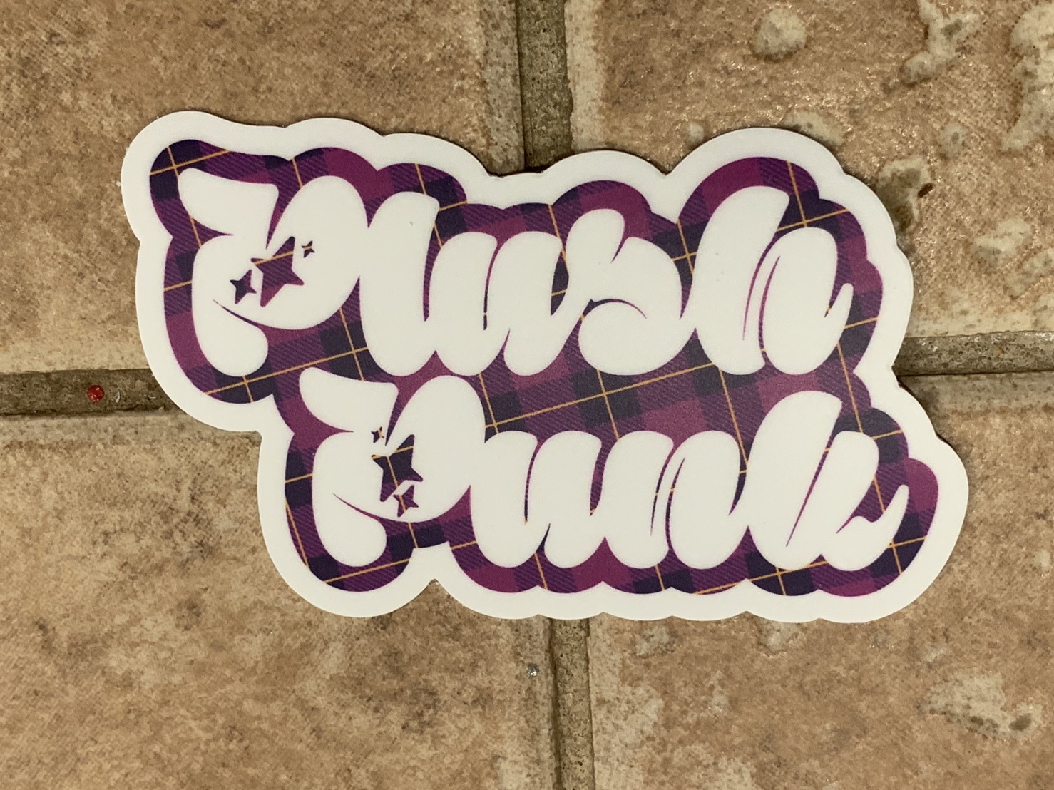 Photos are of stickers in a purple plaid pattern with the words “plush punk” written in a stylized heavy cursive font. The last photo features the sticker being held by a plush, pink sea otter.