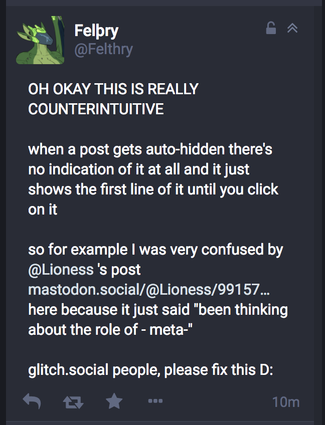 so for example I was very confused by @Lioness 's post https://mastodon.social/@Lioness/99157004218088394 here because it just said "been thinking about the role of - meta-"