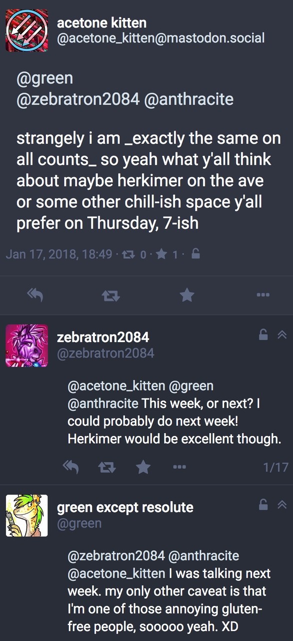 @green @acetone_kitten I had us down for Thursday at 7, but I can't find the toot I got that from now!