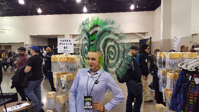 ... just sold two of those pinball necklaces to folks working in the demo area for Stern pinball... I got a pic... that's her real hair, and it took 4+ hours to do.