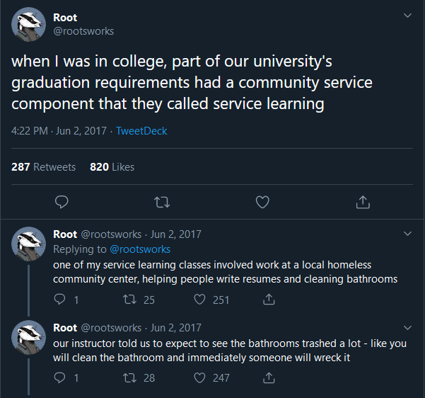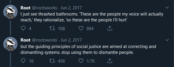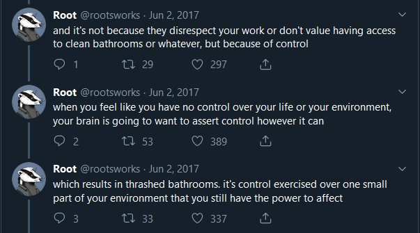 The trashed bathroom thread by @rootsworks@twitter.com is 2 years old now, but you need to read it in 2019 anyway.