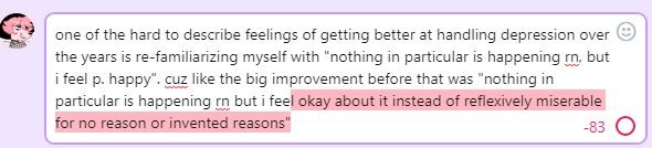 This is a great way to frame depression recovery -- feeling...OK when there's no external stimulus. For almost my entire life, I've felt either miserable or anxious when there was nothing going on. That was the default.