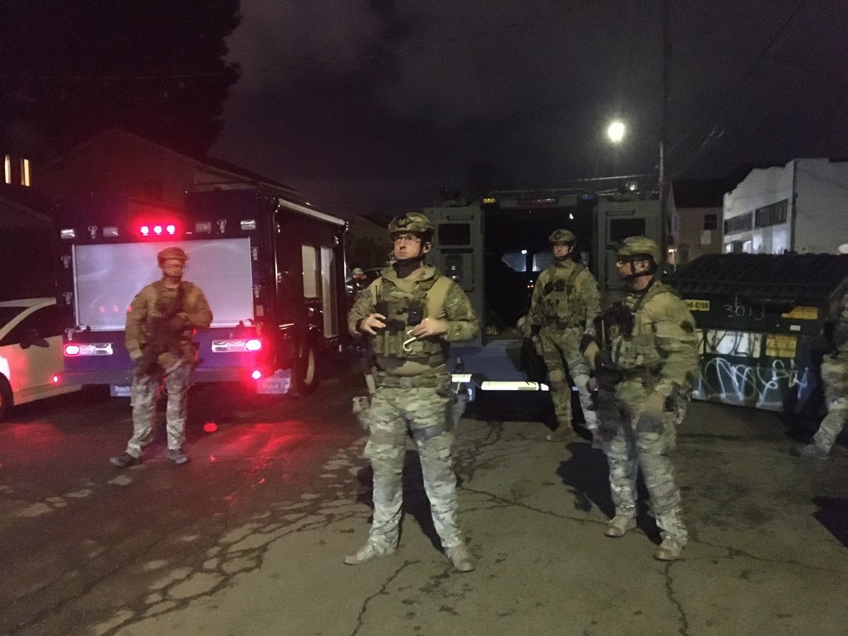 Did you know the Alameda County Sherrif’s office has a tank and soldiers with AR-15s? They’re out here evicting and arresting the @moms4housing@twitter.com at 5am. There is nothing happening at 2928 Magnolia St that justifies this level of force.
