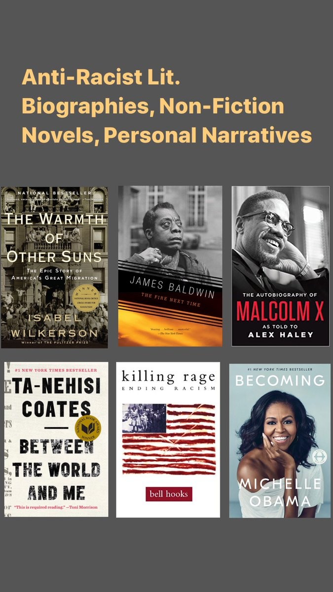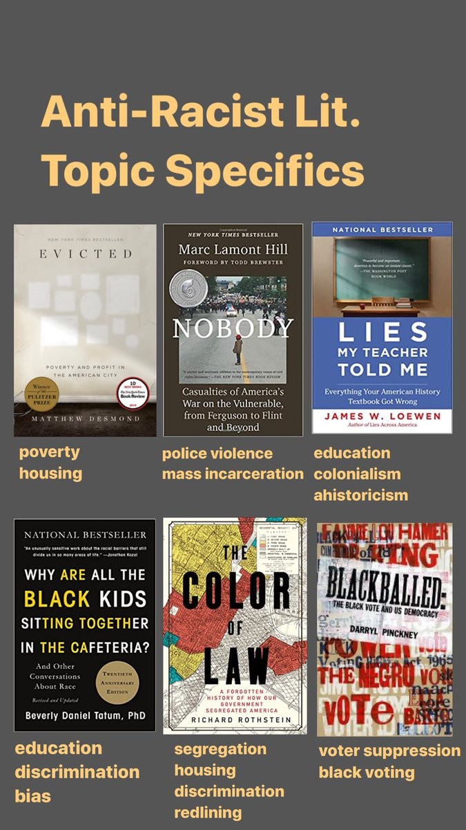 I’ve been getting a lot of questions from my non-Black friends about how to be a better ally to Black people. I suggest unlearning and relearning through literature as just one good jumping off point, and have broken up my anti-racist reading list into sections: