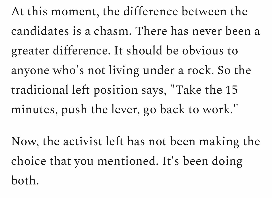 In the coming months you will probably see me cheerleading for the Democratic ticket because it is a strategically correct move and I will probably be able to do it. But you can't rationally demand it of everybody, or expect it to happen right away.