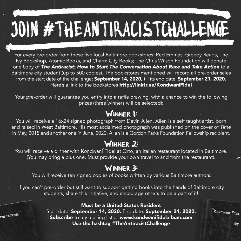 For every pre-order from any of these 5 Baltimore bookstores, The Chris Wilson Foundation will donate a copy to a Baltimore city student. Your preorder will guarantee you entry into a raffle drawing with a chance to win some exclusive prizes. #TheAntiracistChallenge 📚