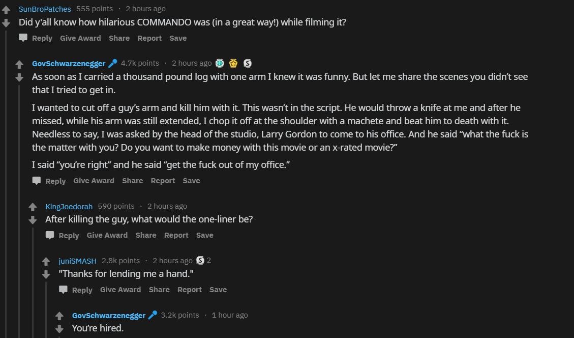 Somehow, the Terminator: Dark Fate trailer posted by Arnold on reddit turned into an AMA and someone asked about Commando....