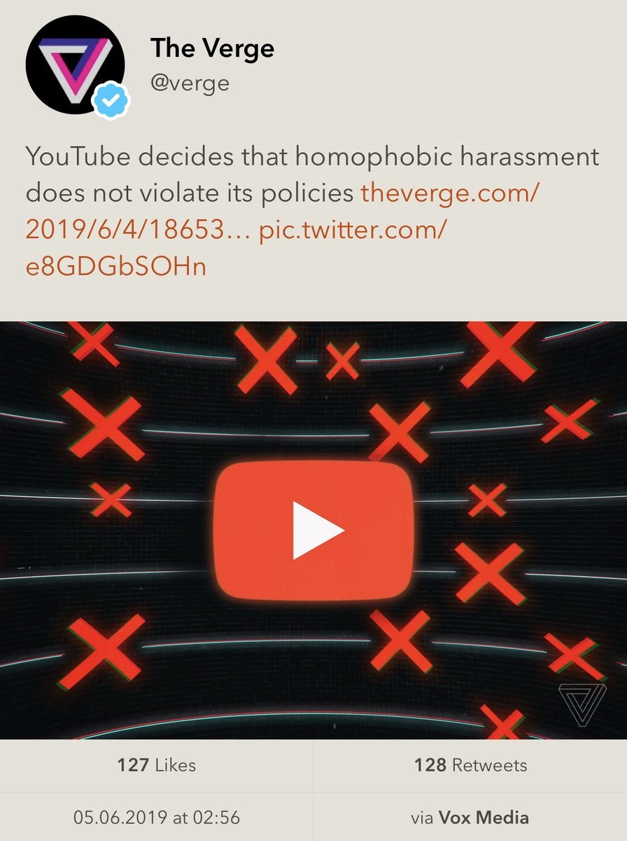 YouTube's handling of this homophobic harassment situation has been so messy that employees are demanding via internal petition that it take Pride branding off its public social media accounts: https://www.buzzfeednews.com/article/carolineodonovan/youtube-demonetize-steven-crowder-mocking-carlos-maza