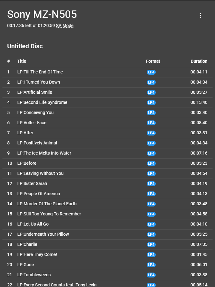 and here's the other one, seems to be a bunch of rock music from the previous owner, these are in the lowest-quality long-play mode