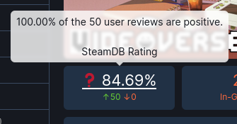 @kinmoku I wonder if they're using the steamdb formula, which is biased towards 50%, especially if there's not a lot of ratings. I don't know why they would, I think Steam's "positive" would work much better there since it's actually mentioned on the website (and I generally prefer it to a numbers rating)