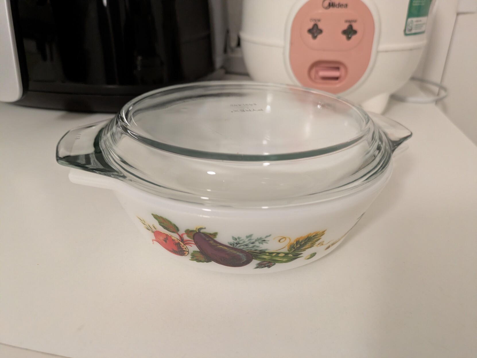 the small casserole dish I have is just straight up white pyrex, but clearly inspired by Corningware design