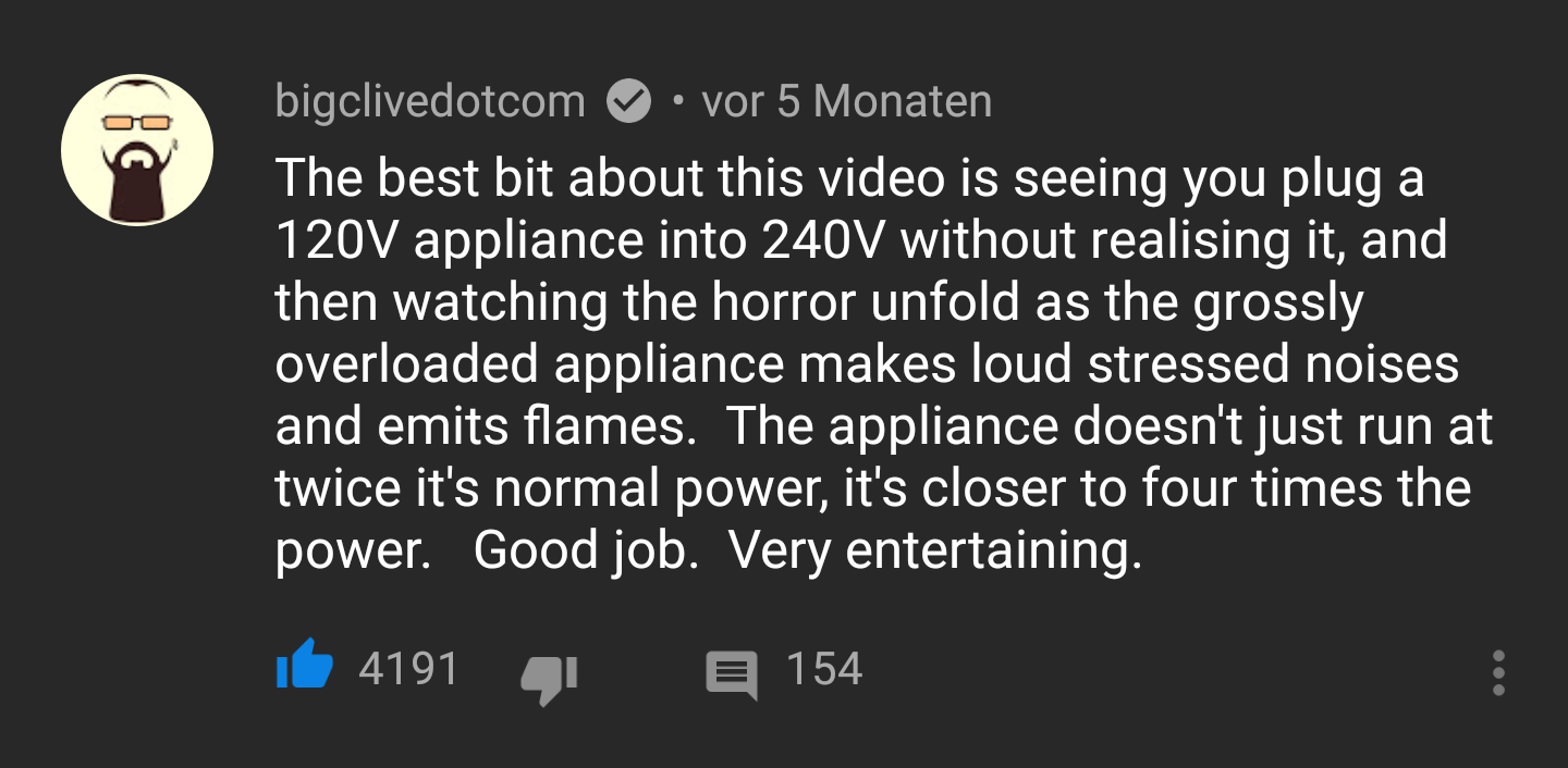 reminder that there's a video where Barry Lewis tries a US grilled cheese toaster on European mains power and it just catches fire https://youtu.be/H66Fbg9nrk4