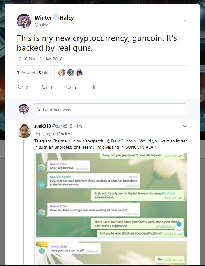 oh my god does this guy really believe I am the Founder of Guncoin which apparently is a real cryptocurrency that exists because it is 2018 and parody has become functionally impossible https://icosahedron.website/media/Roqwd-SZ-uNz74FCy-g
