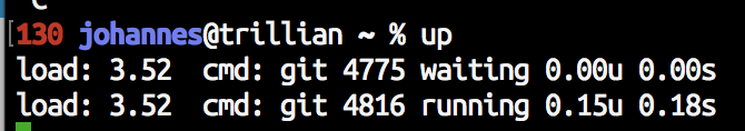 today I learned about Ctrl+T, which sends SIGINFO, which returns process info (apparently programs can have custom info in there, too, but I think this is from my shell)