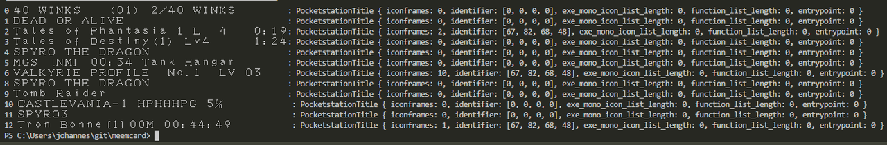 Have some PSX save icons for the Pocketstation! Since the Pocketstation works like a memory card, you can see icons of installed save games, but only games that support it include specialized monochrome icons. All the others get blown up and badly dithered so they're almost impossible to recognize.
