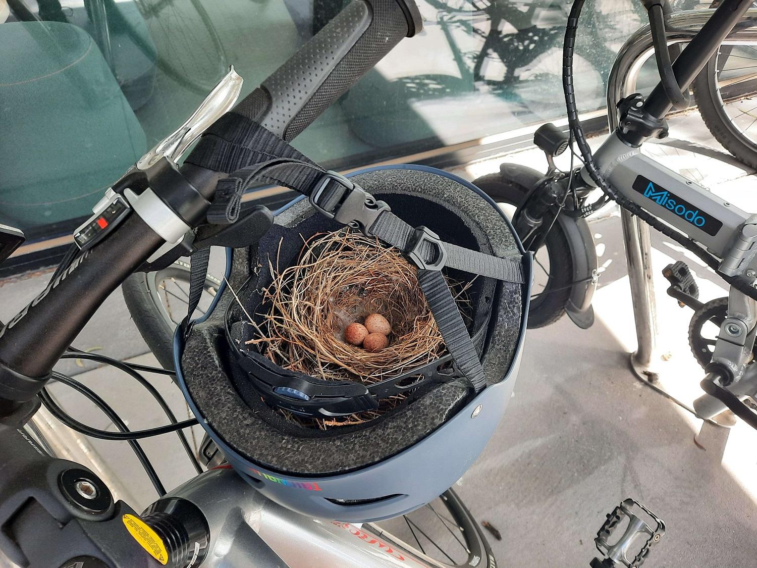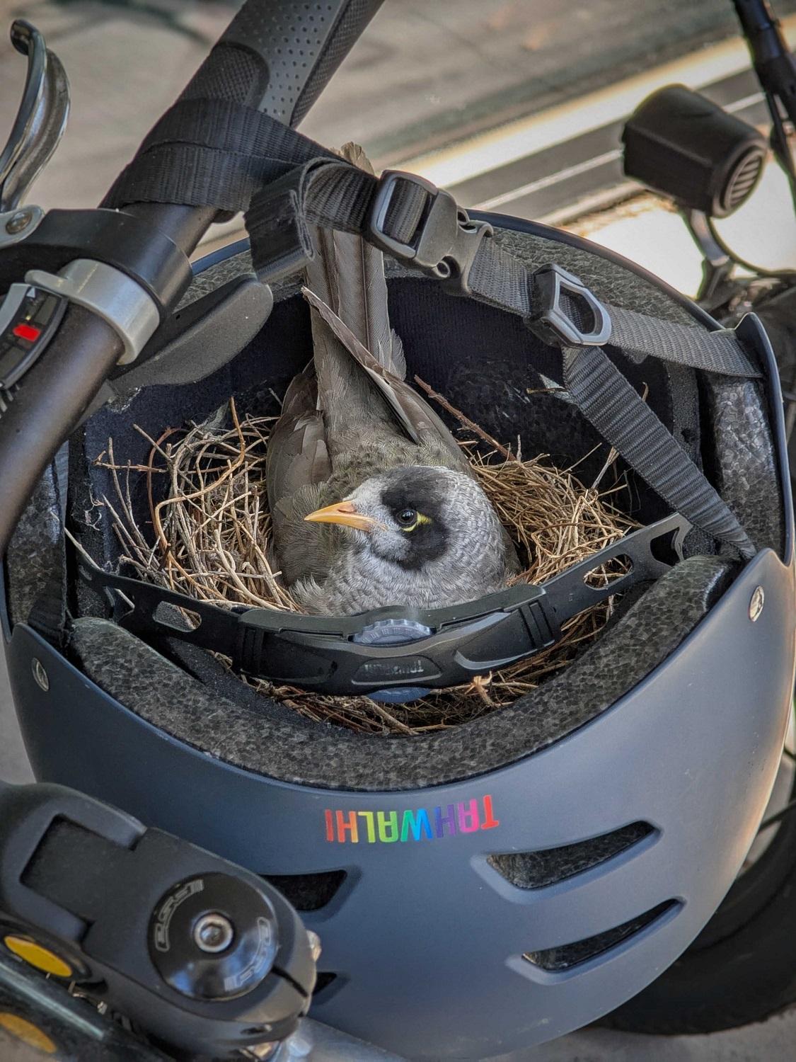 Someone left their bike and helmet unattended outside the Information Technology Faculty building at uni and this little myna bird took advantage of it and built a nest in the helmet. To the delight of all the staff who have been eagerly watching it for the last week or so, Mumma bird has now laid some eggs 😍