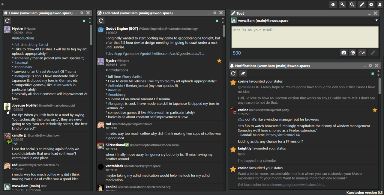Use Kurotodon. It's (subjectively) better than web Masto since you can drag different timelines around and have them be 'pinned' to Kuro. You can also toot from multiple accounts on multiple instances AT THE SAME TIME!