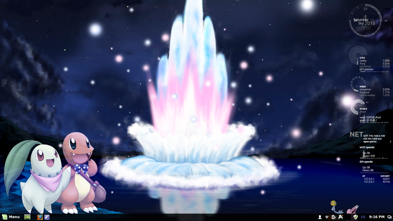 the theme it's using right now is a variation of "conky grey", because i'm a sucker for the look, and it has a lot of practical information that i use pretty often (well, except for the clock around the date, but it looks weird without it, haha)