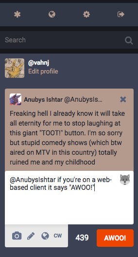 @AnubysIshtar if you're on a web-based client it says "AWOO!" thanks our theme :D https://awoo.space/media/MNCOajfeLUPpbaVcy1Y