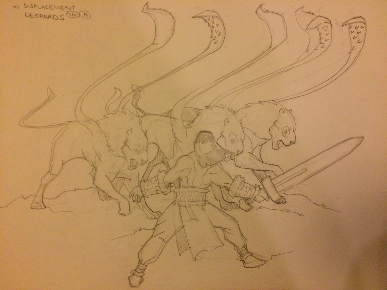 CW for fantasy violence. #DnD #drawings from today (the gnolls) and from Wednesday but tightened today (displacement leopards; the barbarian’s trusty Bracers of the Minotaur helps him wield his plundered giant sword).