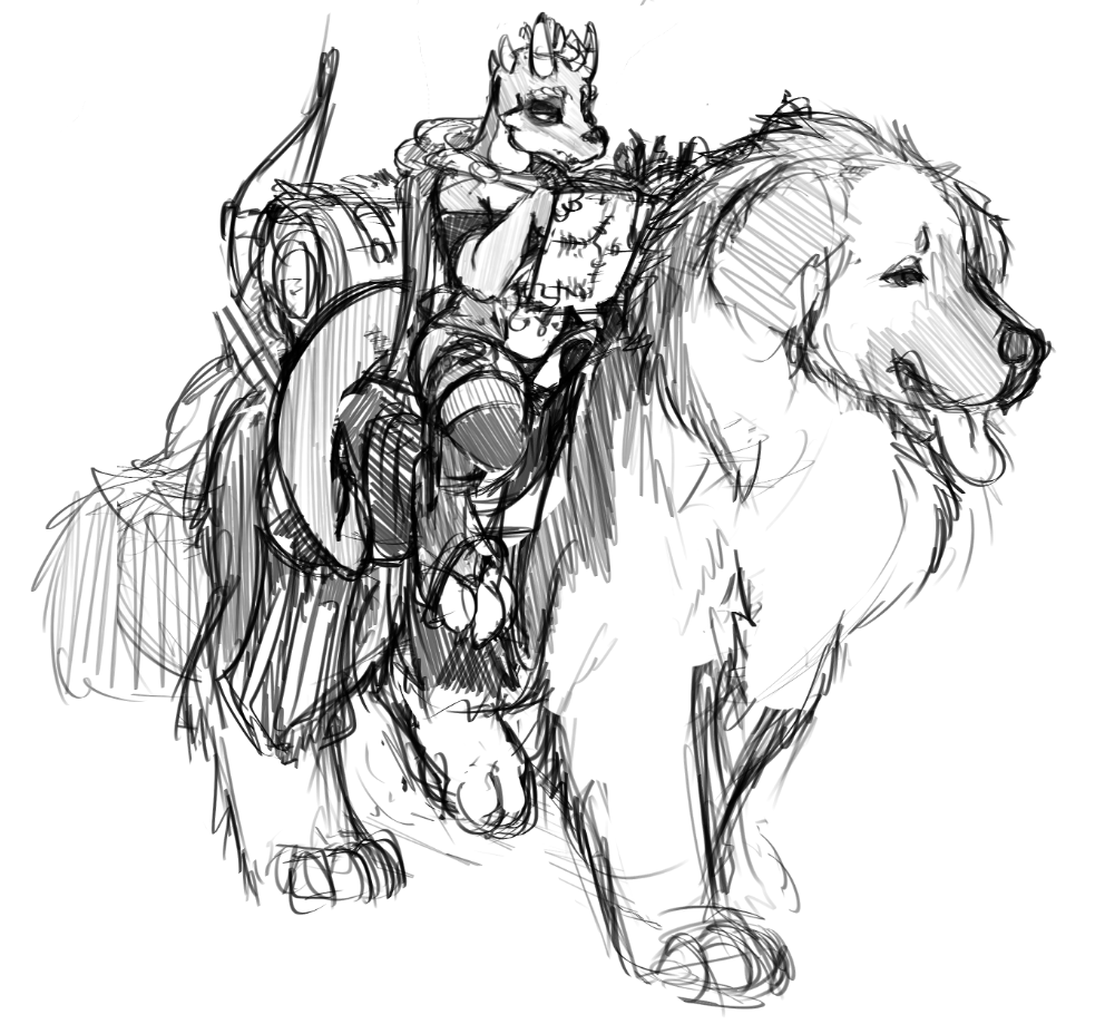 A kobold and her dog, now properly scaled because kobolds are tiny and this dog is huge