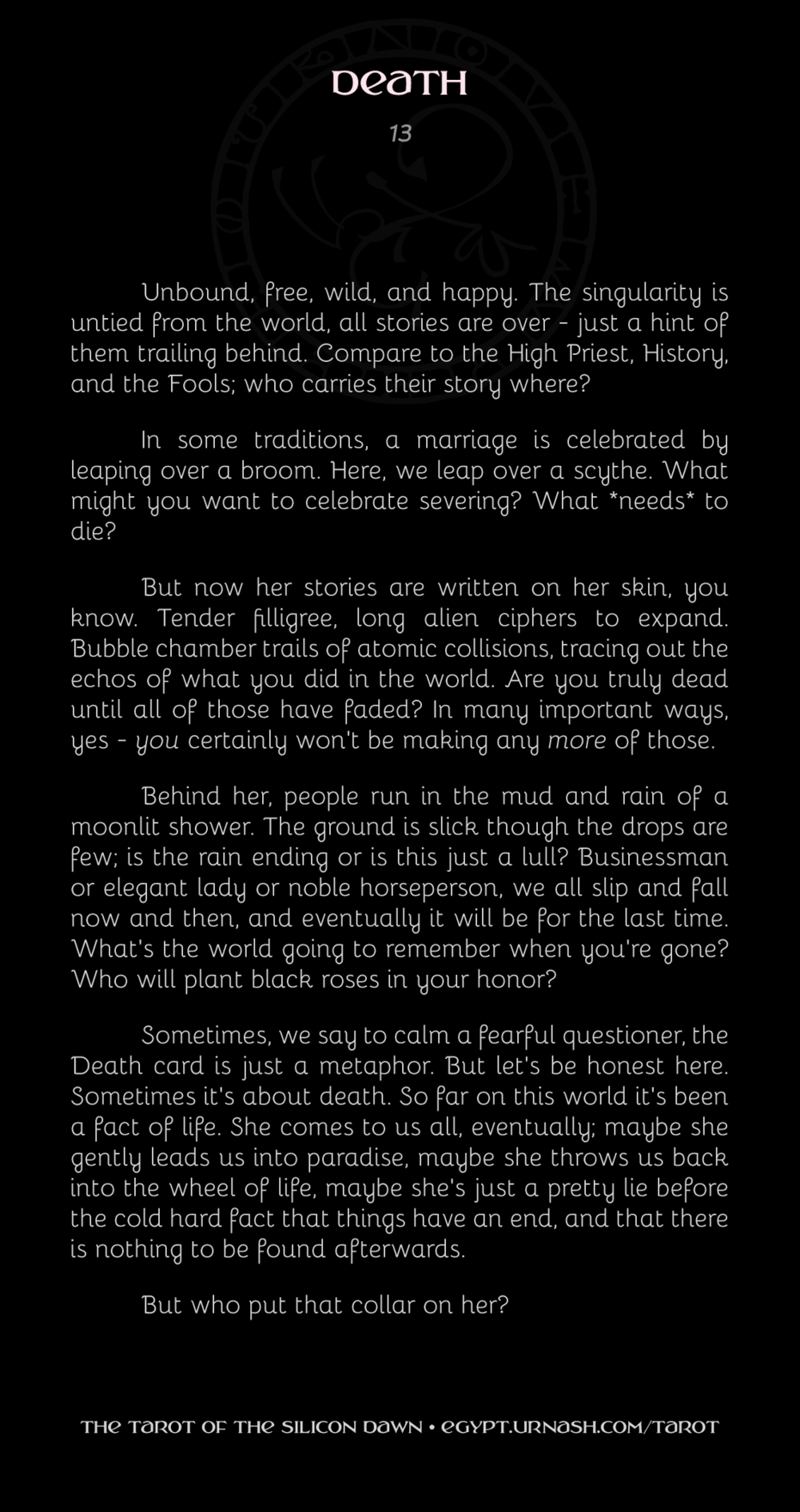 @dodec @silicondawn I mean, she is the semi-secret lead in our comic so I guess it's not really surprising she's attracted to the deck these days! FWIW I think Twin is much more likely to be the "everything withers and i want to help you accept it" Death than the RAWR WATCH AS I REAP ALL LIFE kinda Death...