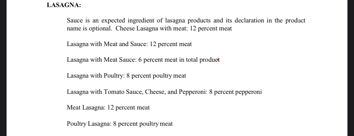 so, it turns out that “Lasagna with Meat & Sauce” has, by definition, “Lasagna with Meat Sauce”, so that frozen lasagna I showed a photo of earlier only had 2x the meat of a product that it wasn’t, the defining legal difference being a factor of 2 in meat.