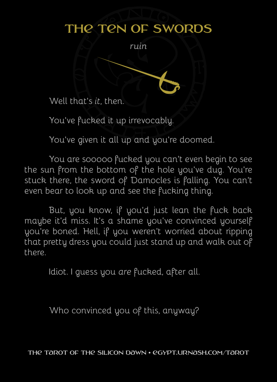 Oh, right, Internet, country, postfurry (or at least my relationship with it?), libido, and self-esteem are all a total burnout shitshow. :) But still. All I gotta do is actually go out there and make a few Charisma rolls. Probably with a cute dragon lady leaning on my shoulder. Piece of cake, right?