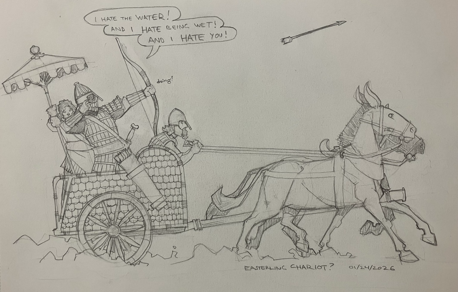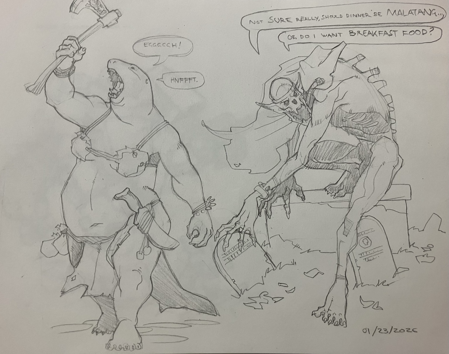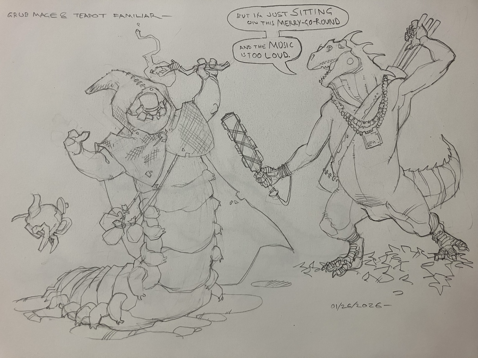 Feeling bad this morning, but eh. Here’s last night’s ! Originally I thought a grub wizard, bloated and pallid under its cloak, would be horrid and as I drew it I thought it was more cutesy, so I added the teapot.